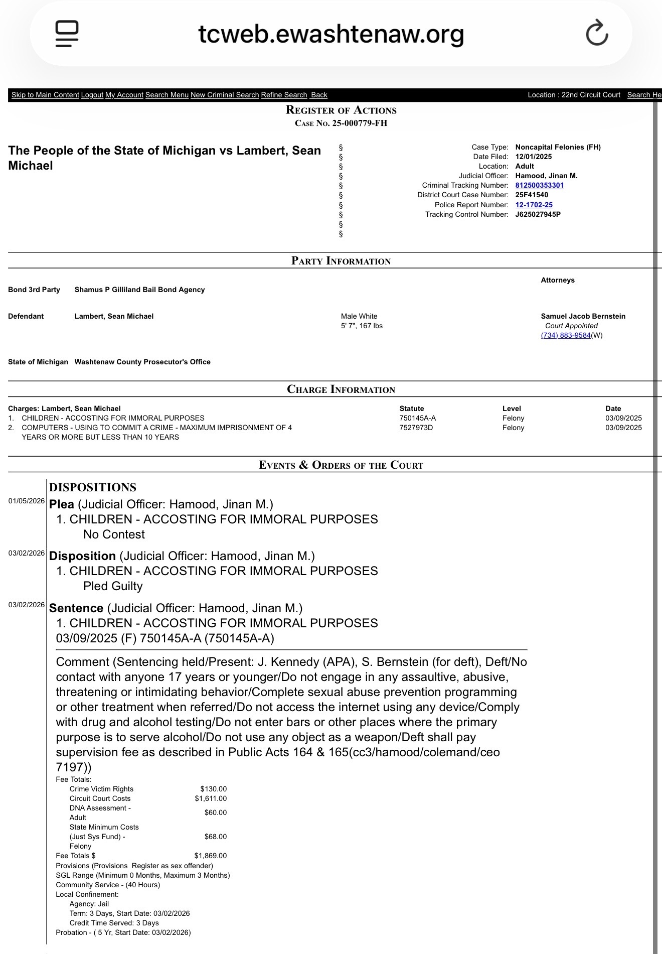 Sean Lambert of Ypsilanti Michigan has been SENTENCED to 5 years of probation. This was a catch with Predator Poachers.