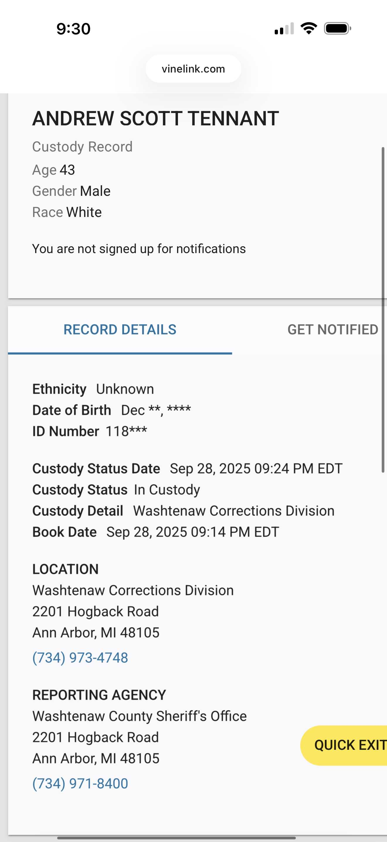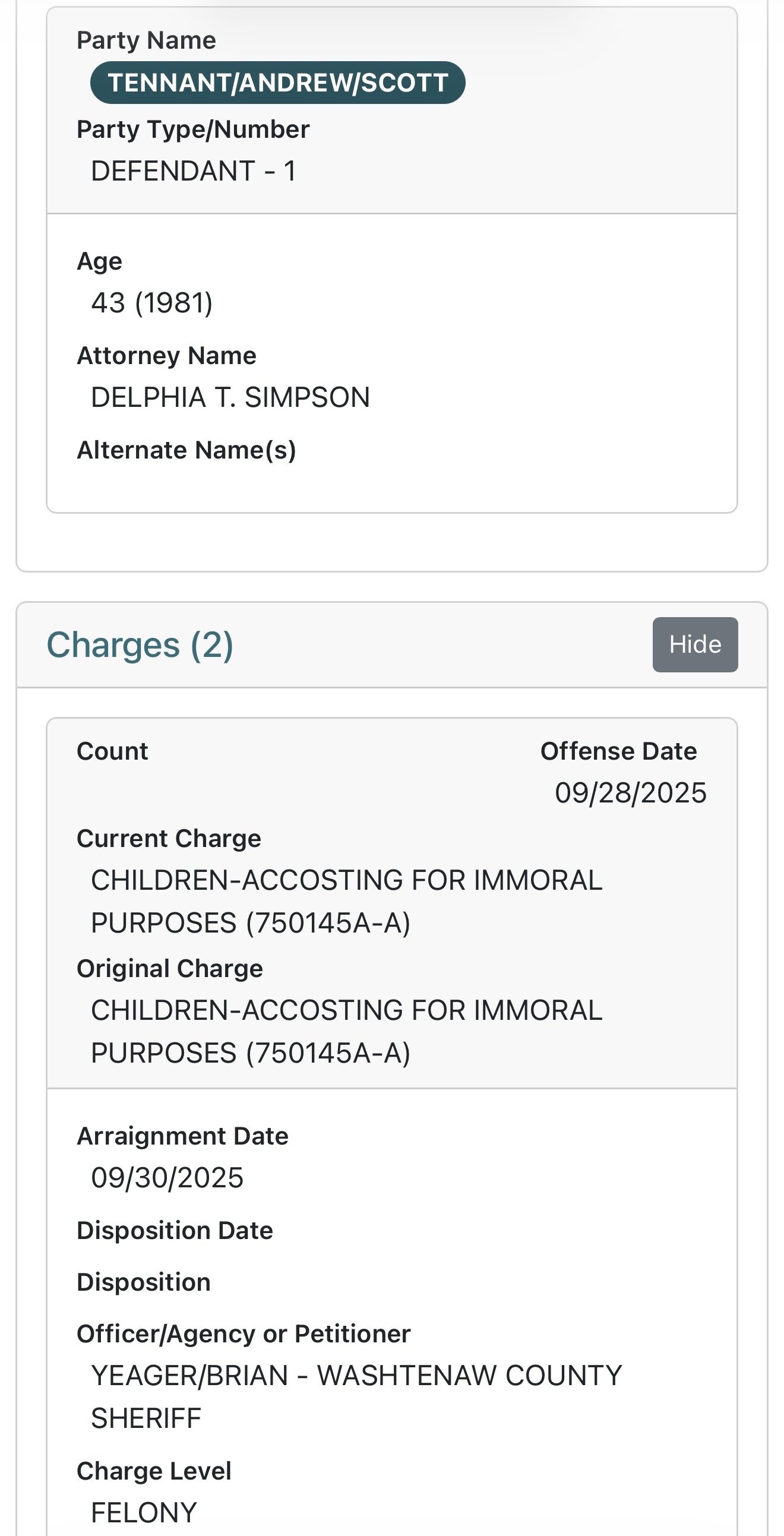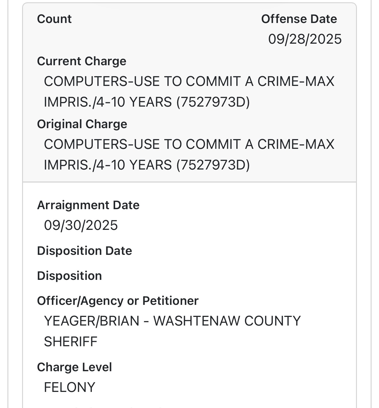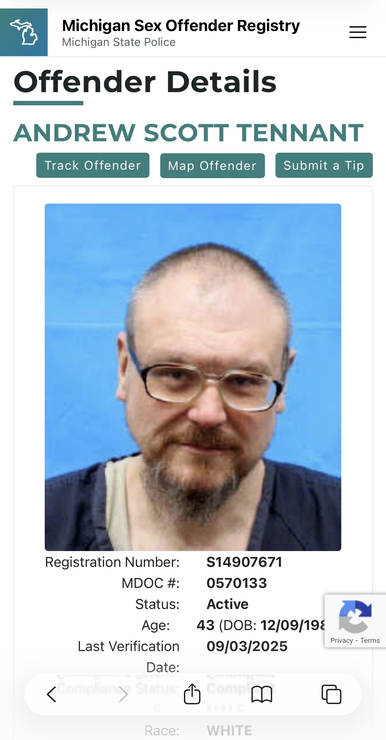 Andrew a RSO of Ypsilanti, MI has been arrested and charged. He’s currently being held on a $75,000 bond. We’re hopeful we will see additional charges in the near future.