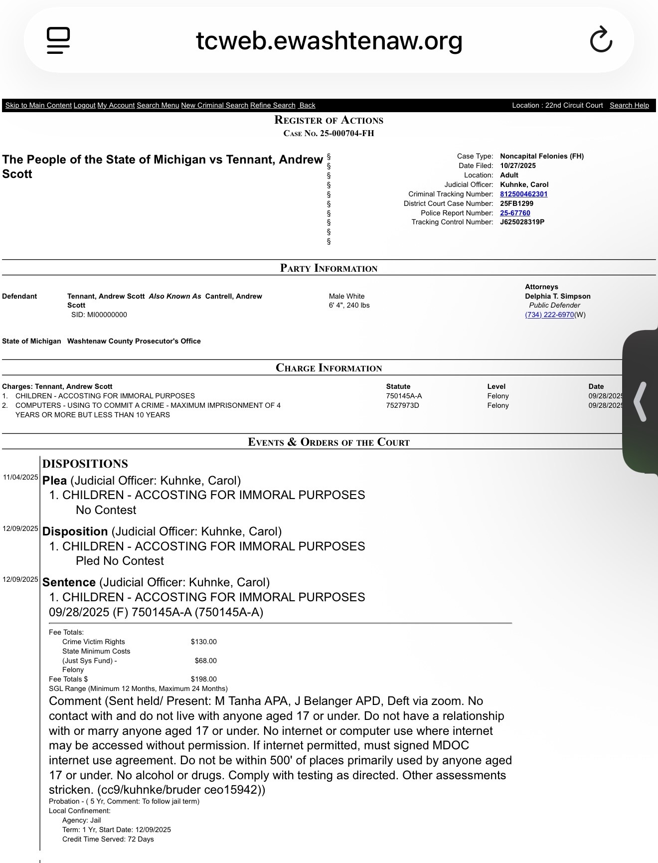 Andrew Tennant, an already 2 time RSO of Ypsilanti, Michigan has been SENTENCED. He will serve 1 year with credit for 72 days served.