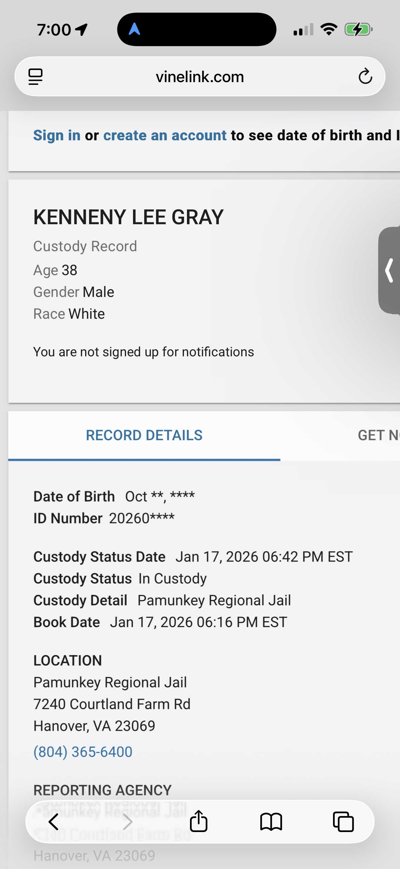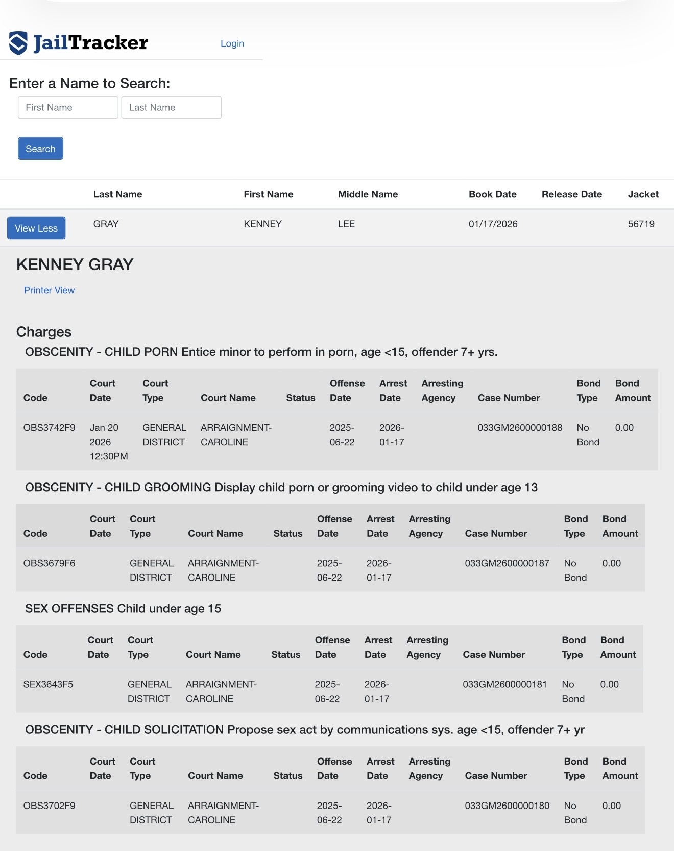 Kenney Gray of Ruther Glen, Virginia was arrested on scene and charged with 4 felonies!