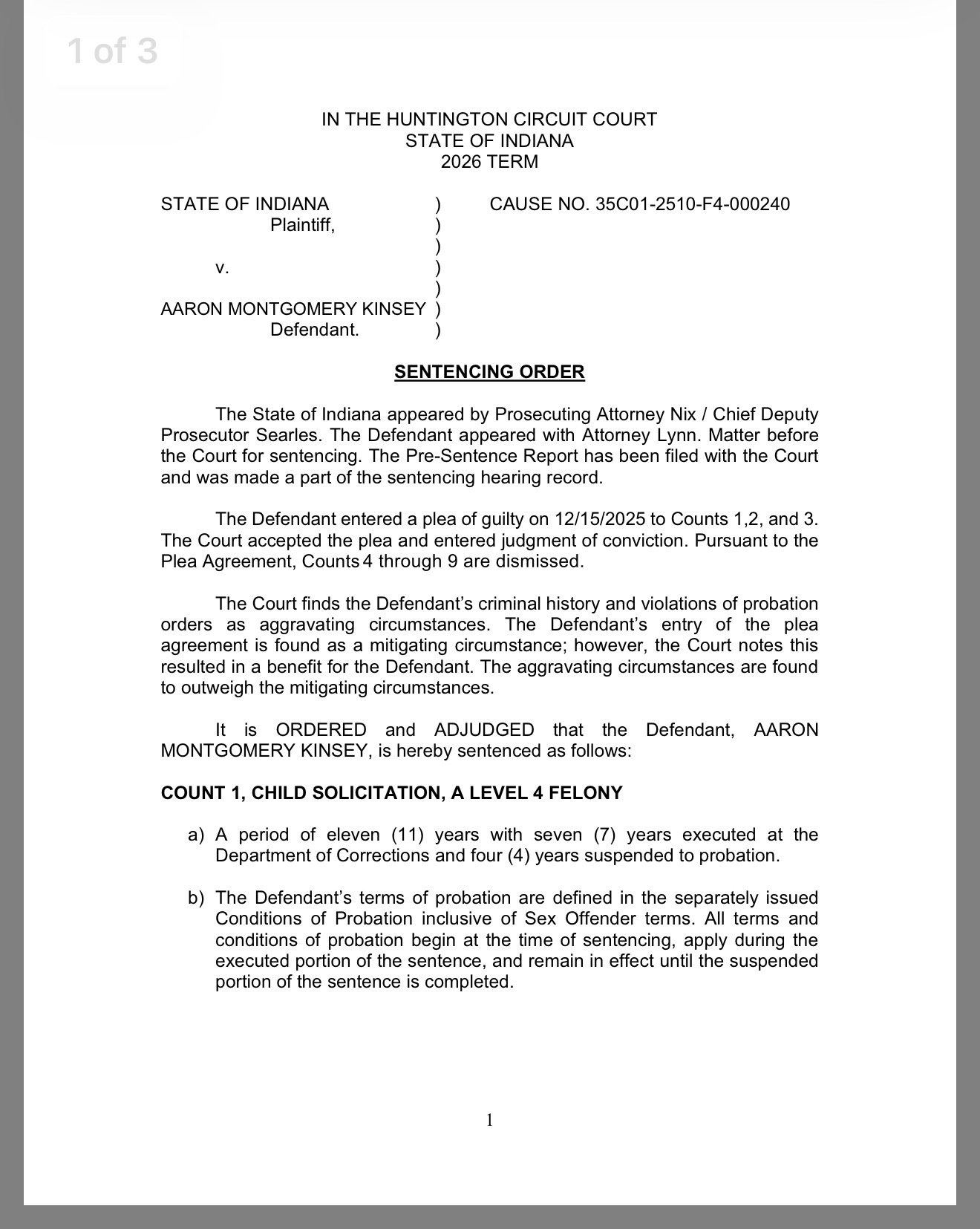 Aaron Kinsey of Huntington, Indiana has been SENTENCED! He will serve a total of 9 years in the Indiana DOC.